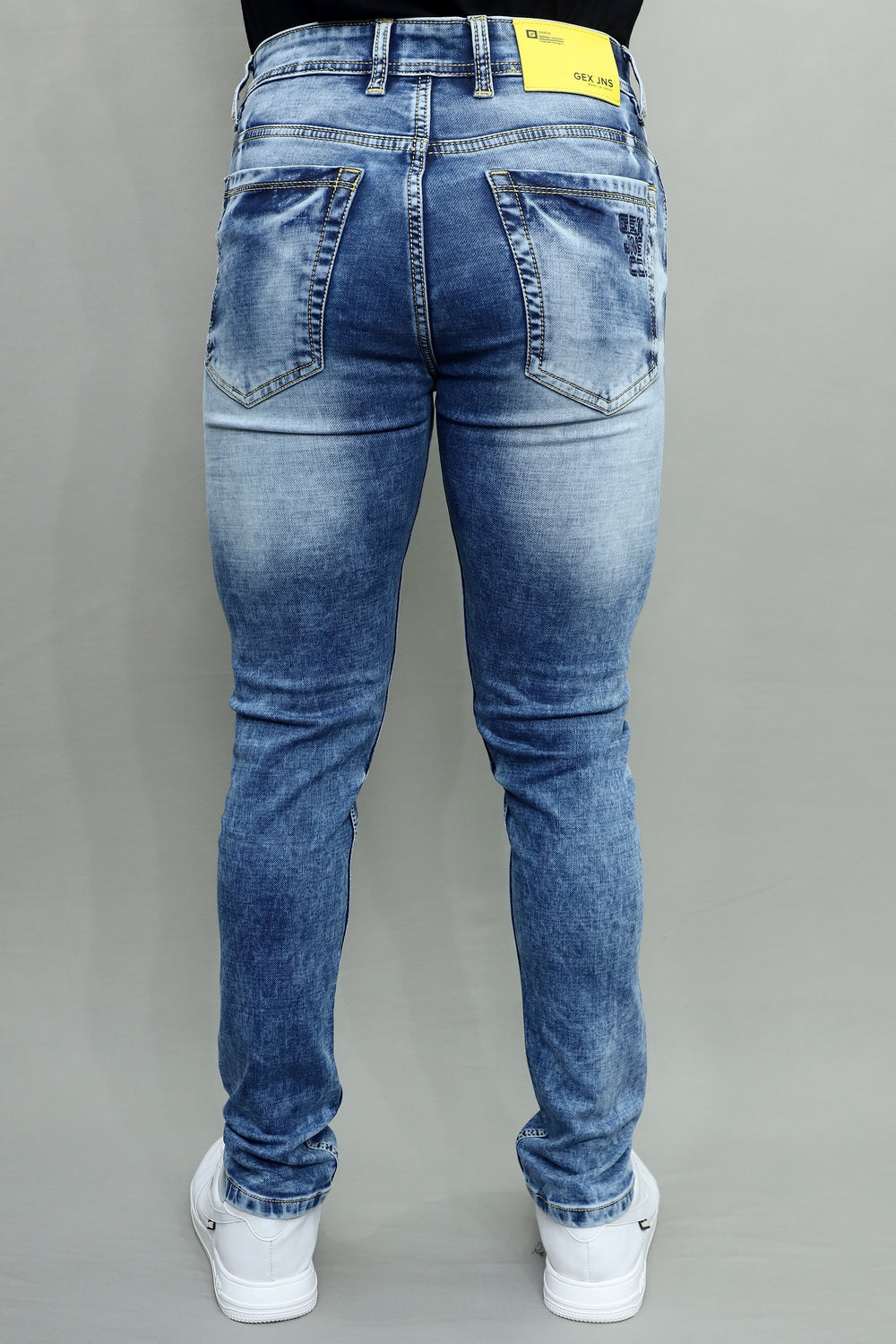 GEX Men’s Blue Distressed Slim Fit Stretch Jeans – Stylish Patch Denim